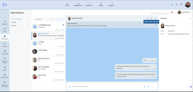 Com os chats internos, toda a comunicação entre atendentes e supervisores acontece de forma integrada, rápida e organizada. É possível criar conversas diretas entre dois operadores ou grupos com diversos operadores, facilitando a colaboração entre equipes, a troca de informações e a tomada de decisões em tempo real.